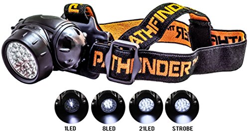 Description of PATHFINDER 21 LED Headlamp Headlight - Water-resistant. 4 Modes Of Operation, Head Safety, Lamp, Flash Light, Torch For Cycling, Climbing, Mountain Biking, Camping, Night Reading. Adjustable Beam Angle. 100,000 Hours LED lifetime (in RETAIL PACKAGING) (BLACK)